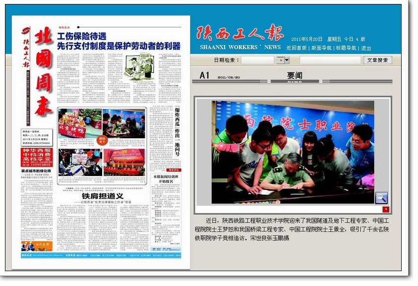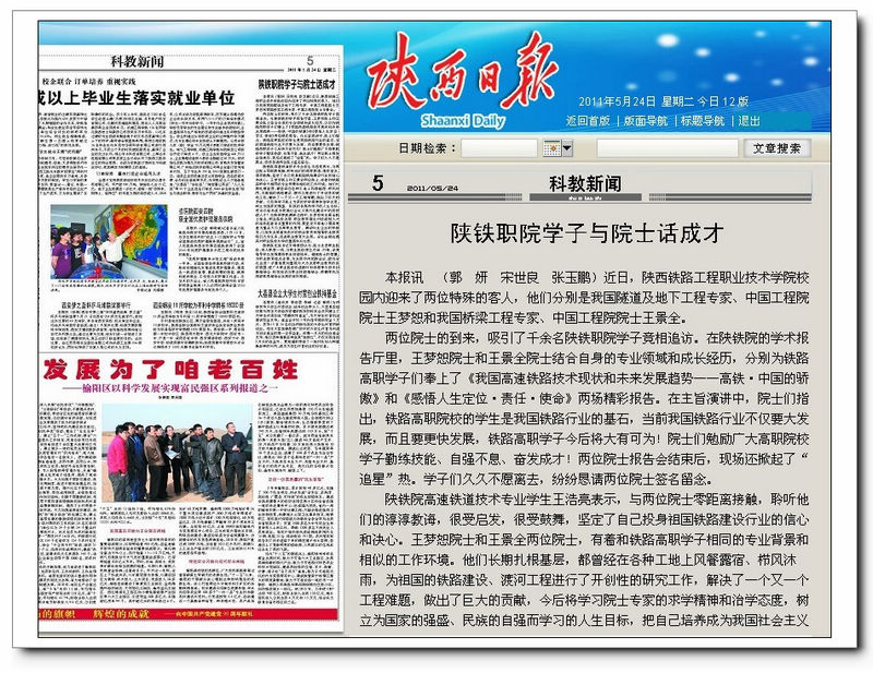 5月24日,《陕西日报》科教版以“陕铁职院学子与院士话成才”为题,关注报道了中国工程院院士走进陕西铁路工程职业技术学院,与青年学子共话成才之路活动。5月20日的《陕西工人报》头版和5月24日的《铁路建设报》第3版也对此项活动进行了报道。现将全文转载如下: