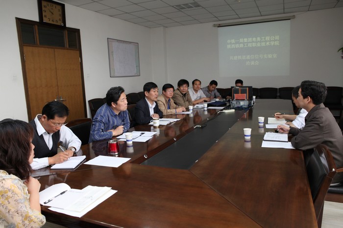 为推动专业建设,加强校企合作,促进学生动手能力培养,提高人才培养质量,5月24日上午,中铁一局集团电务工程公司与陕西铁路工程职业技术学院共建铁道通信信号实验室洽谈会,在学院十一楼会议室召开。陕铁院院长王长友,副院长焦胜军,中铁一局集团电务工程公司第五工程公司经理苗维礼、书记王军义出席洽谈会。