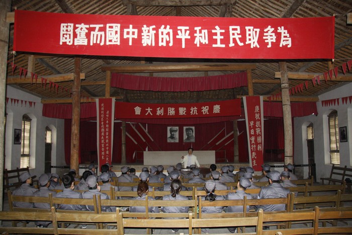 在王家坪革命旧址的军委礼堂里,全体学员进行集中学习延安十三年的历史贡献