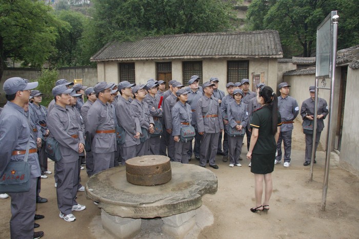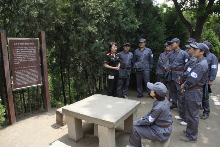 在杨家岭毛泽东与美国记者斯特朗交谈的石桌前,学员们饶有新兴趣的听取讲解员介绍当时的情况,感受伟人风采