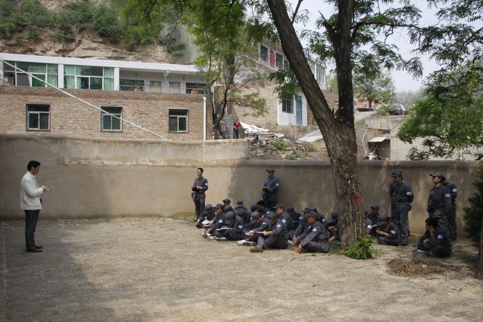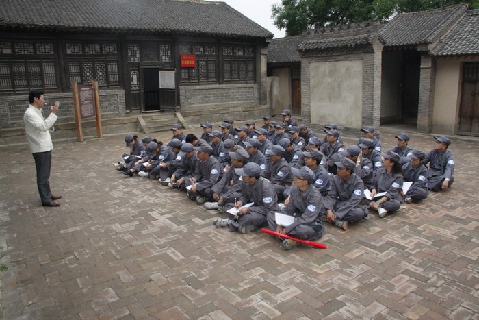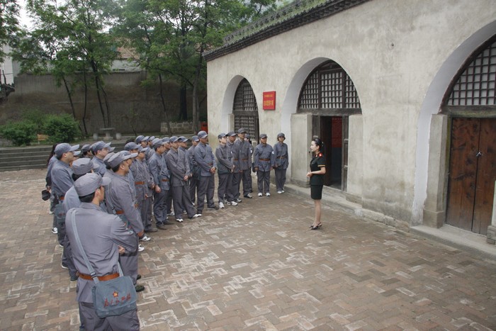 全体学员在杨家岭革命旧址席地而坐,学习党的理论武装与建设方面的内容