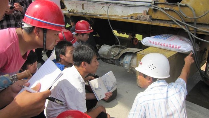 现场技术员为学生进行讲解架桥机架梁作业程序