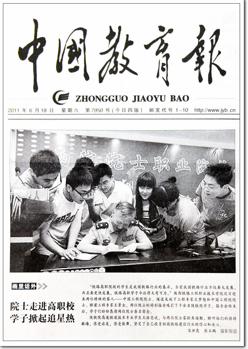 继6月3日教育部官方报纸《中国教育报》以“陕铁院学生党员高铁工地创先争优”为题,关注报道了陕铁院赴高铁工地工学实践的大学生党员们结合工作岗位创先争优的活动新闻之后,6月18日,《中国教育报》再度聚焦陕西铁路工程职业技术学院,以“院士走进高职校  学子掀起追星热”为题,对学院“两院院士职业院校行”活动进行了关注报道。短短两周时间内,陕铁院得到了《中国教育报》连续两次的关注报道,充分表明了国内惟一一份国家级的、面向全国教育界的教育日报对学院好的做法的高度认可。现将全文转载如下: