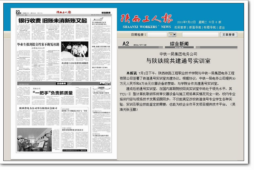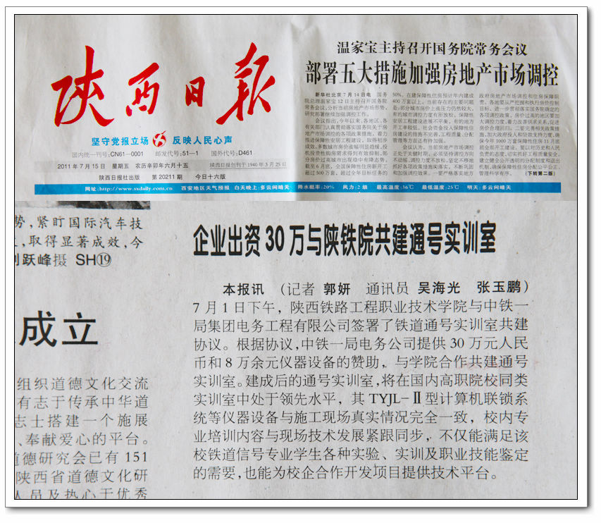 7月15日,中共陕西省委机关报《陕西日报》以“企业出资30万与陕铁院共建通号实训室”为题,对陕西铁路工程职业技术学院创新校企合作机制,拓宽校企合作领域,与中铁一局电务公司共建通号实训室的消息进行了关注报道。 这也是今年以来《陕西日报》第四次关注报道陕铁院。另外,7月12日的《陕西工人报》和7月8日的西部网(陕西新闻网)也分别对这一消息进行了报道。报纸截图如下: