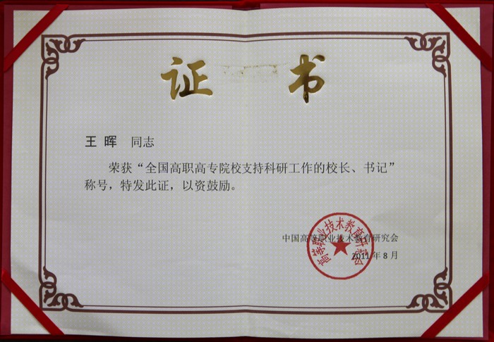 王晖被评为“全国高职高专院校支持科研工作书记”