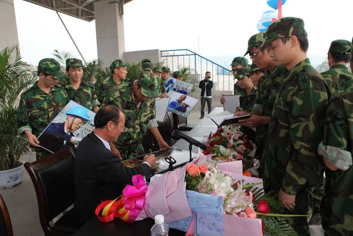 窦铁成精神深深打动了每一位听众,在短短一个小时的报告中,被20余次热烈的掌声不停打断。报告会结束时,学院3500名新生自发喊出了“向劳模学习、向劳模致敬”的心声,声浪愈喊愈高,持续了两分多钟。学生们更是跑到劳模跟前,纷纷恳请签名留念。火热的场景让窦铁成也十分感动,他说,我作了这么多场报告,但是这一场人数是最多的,掌声次数是最多的,要求签名是最多的,场面是最热烈的。