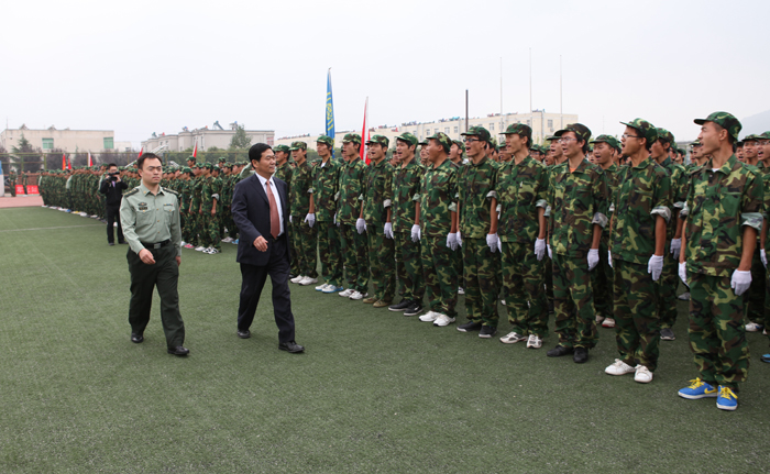 汇报会上,王晖为感谢部队为学员军训所作的贡献,向部队授锦旗。王长友检阅了新生军训各连队。