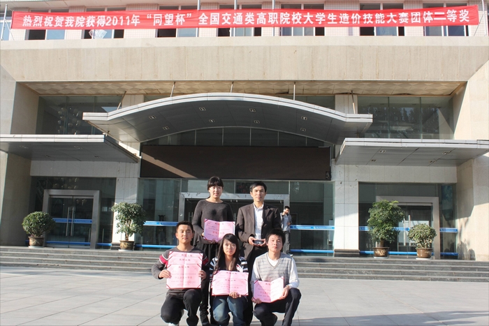 10月11日-16日,由交通职业教育教学指导委员会主办的2011年“同望杯”全国交通类高职院校大学生造价技能大赛在四川举行。学院选派道路桥梁技术专业09级3名学生参赛,获得总分第五名的好成绩。其中,学院获集体项目二等奖,个人项目中获一等奖3项、二等奖1项、三等奖2项。