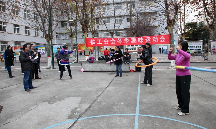 12月7日下午,铁道工程系分会在球场举行了教工冬季趣味运动会,运动会设置了循环跳大绳、你去比划我来猜等2个集体项目和单人跳绳、趣味投篮、趣味呼啦圈等4个单人项目。图为趣味呼啦圈项目比赛现场 。