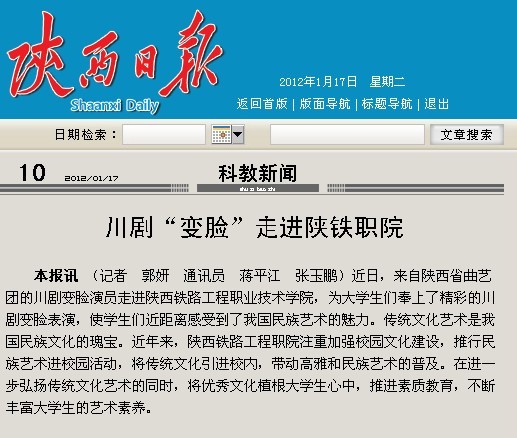 1月17日,《陕西日报》第十版以“川剧‘变脸’走进陕铁职院”为题,报道了陕西省曲艺团的川剧变脸演员来到陕西铁路工程职业技术学院,为大学生们展示变脸绝技的消息。现将全文转载如下: