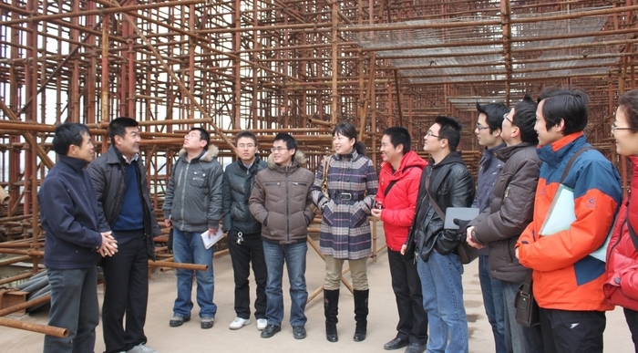 道桥系教师在西宝高铁项目部总工宋贵军、安全总监刘晓飞、办公室主任王宏刚的陪同下,参观了咸阳西立交特大桥和咸阳西高铁车站施工现场,学习了梁拱组合式铁路桥梁边跨预压、钢管拱肋的预制吊装焊接、轮扣式支架法拼装主拱肋等先进的施工工艺,并就主拱圈的变形监测与纠偏、拱座的精确预埋定位、实验室及混凝土拌和站标准化管理等问题与公司技术骨干进行了深入探讨。(曾绍武)