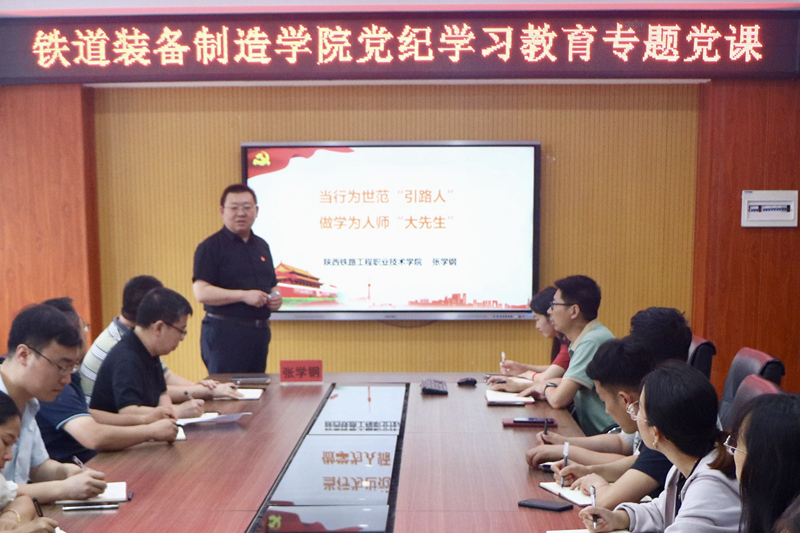 7月3日下午,副校长张学钢以“当行为示范的‘引路人’ 做学为人师‘大先生’”为主题为铁道装备制造学院学院全体党员教师讲授党纪学习教育专题党课。