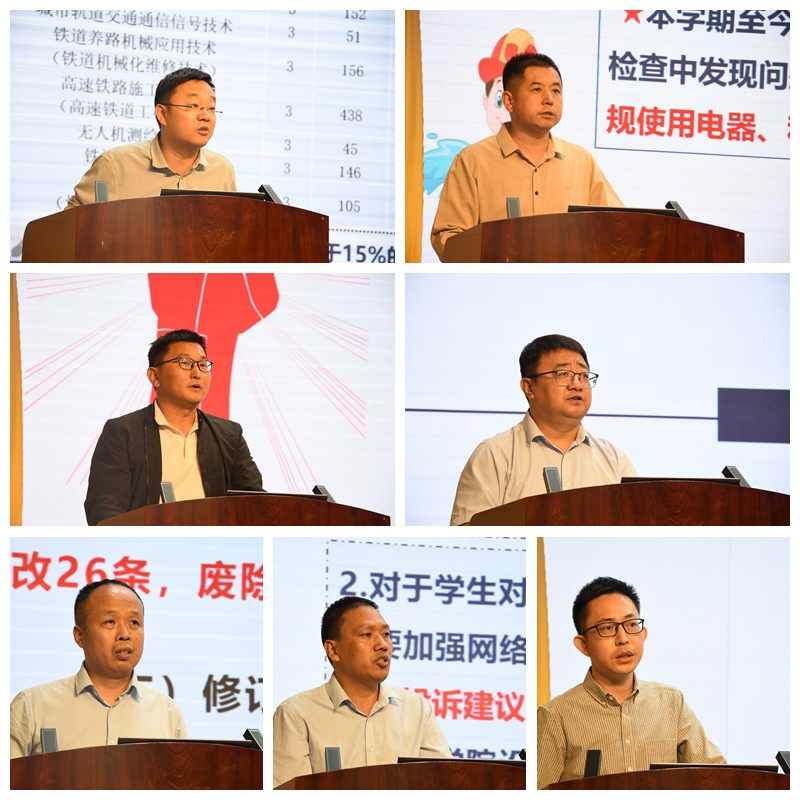 会上,就业指导中心主任姜留涛针对就业工作、后勤保障与安全保卫处处长李晓飞就后勤安保工作、校团委书记姚天魁就共青团工作、学生处处长陈明明就近期学生工作做了具体部署。学生处副处长黄阿岗解读了学生手册、“四大行动”修订工作,学生处副处长赵增逊汇报了“一站式”学生社区建设等相关工作,心理健康教育中心副主任赵智军做了心理管理系统培训。(吕泊怡)