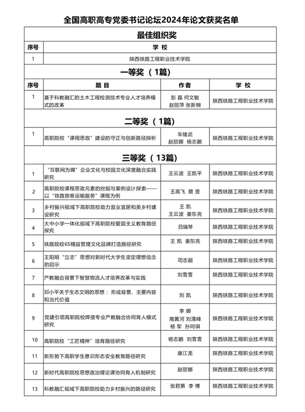 10月25日—26日,全国高职高专党委书记论坛在天津召开,学校党委副书记李林军,党政办主任、党委宣传部部长王云波参加会议。会议期间,举行了论坛2024年论文颁奖仪式,学校获得优秀组织奖,学校报送的25篇论文中,有15篇论文获奖,其中一等奖1篇,二等奖1篇,三等奖13篇。