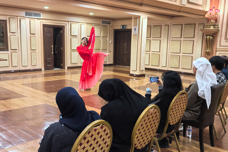 在纳奇的陪同下交流团赴巴林王国考察交流,受到巴林公主、巴林留学生文化中心主任蒂娜・法赫德博士的亲切接见。期间,杨旭在艺术馆中表演了中国古典舞蹈“惊鸿舞”,其优美的舞姿与独特的东方韵味令在场观众如醉如痴,赢得了蒂娜公主的高度称赞。蒂娜公主对中国文化艺术表达了浓厚的兴趣,并表示希望与陕铁院建立长期稳定的艺术文化交流机制,进一步探讨达成实质性的合作协议,为两国文化交流与人才培养搭建更为广阔的平台。