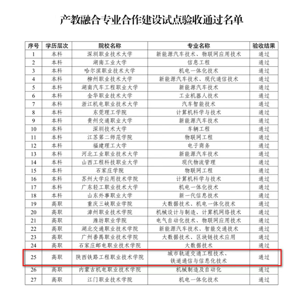 12月3日,工业和信息化部人才交流中心发布了《关于公布产教融合专业合作建设试点验收结果的通知》,学校申报与建设的城市轨道交通工程技术和铁道通信与信息化技术2个专业试点经过专家审查、中心审核均顺利通过验收。