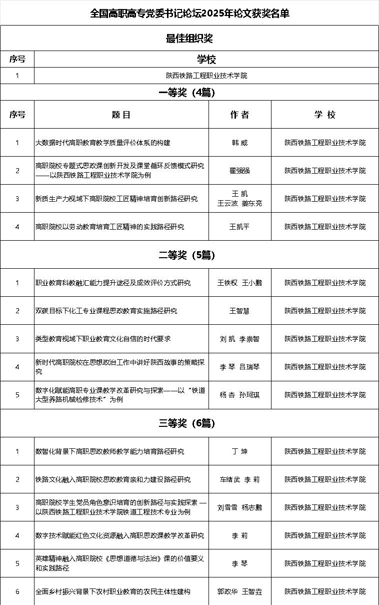 全国高职高专党委书记论坛2025年论文征集活动于今年6月至8月举行,共收到论文937篇。全国高职高专党委书记论坛学术委员会聘请20位评委,按照全国高职高专党委书记论坛2025年论文评选标准,秉着公平公正的原则,对参评论文进行了评审,共评选出一等奖论文97篇,二等奖论文134篇,三等奖论文233篇。