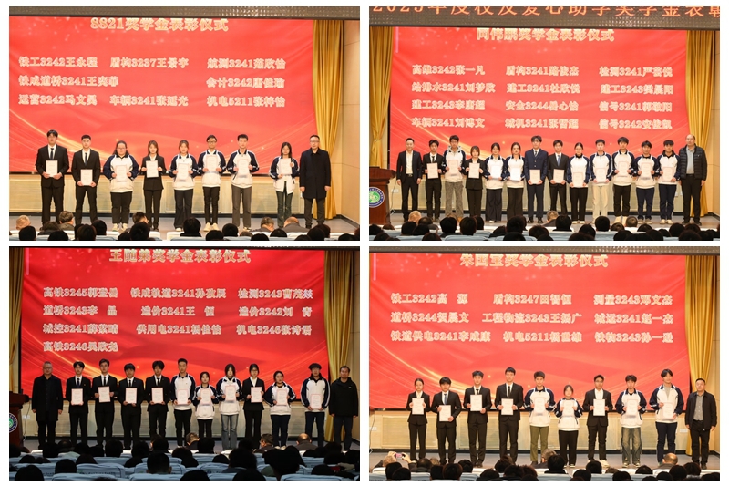 11月26日下午,学校2025年度“8821”、朱国宝、同伟鹏、王随弟校友爱心助学奖学金表彰暨优秀校友大讲堂活动在高新校区博爱厅举行。副校长祝和意出席活动并讲话,校友工作处处长姜留涛、城轨工程学院党总支书记任庆国、道桥与建筑学院党总支书记李强、工程管理与物流学院党总支书记张玉鹏、优秀校友同伟鹏和校友奖学金全体获奖学生、高新校区学生代表300余人参加了表彰活动。活动由校友工作处副处长苏昭主持。
