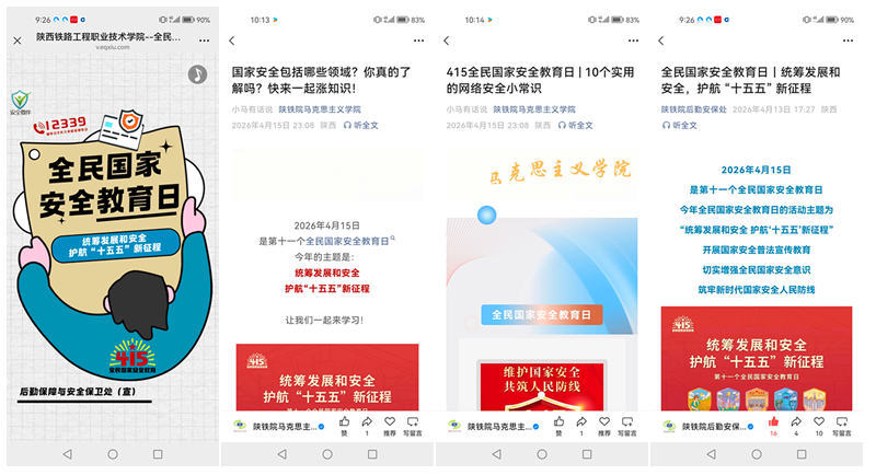 4月15日是第11个全民国家安全教育日,主题为“统筹发展和安全护航‘十五五’新征程”。学校创新宣传形式,通过“线上答题、思政大课、主题展板、微信专题和电子屏联动”五位一体模式,开展系列宣教活动,营造“国家安全、人人有责、人人可为、人人尽责”的浓厚氛围,推动总体国家安全观在校园落地生根。